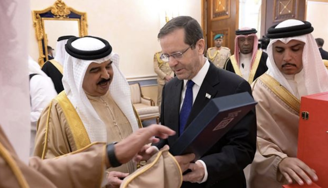 قدم الرئيس الإسرائيلي إسحاق هرتصوغ، اليوم الأحد، هدية خاصة للعاهل البحريني الملك حمد بن عيسى آل خليفة، فور وصوله إلى المنامة في زيارة رسمية.وذكرت وسائل إعلام بحرينية وإسرائيلية أن هرتصوغ أهدى العاهل البحريني “مزوزاه من الفضة”، وهي إحدى الرموز الدينية الإسرائيلية، وذلك فور عقد لقائهما الأول في العاصمة المنامة، حيث يزورها هرتصوغ لعدة أيام.