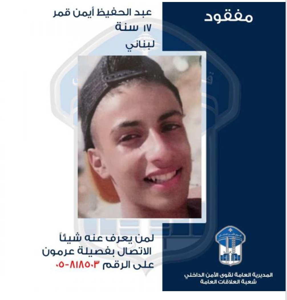 عمِّمت المديريّة العامّة لقوى الأمن الدّاخلي في بيان، بناءً على إشارة القضاء المختص صورة المفقود: “عبد الحفيظ أيمن قمر (مواليد عام 2006، لبناني) الذي غادر مكان عمله في محلة عرمون- شارع ليبانون تاكسي بتاريخ 09-01-2023 ولم يَعُد لغاية تاريخه”.