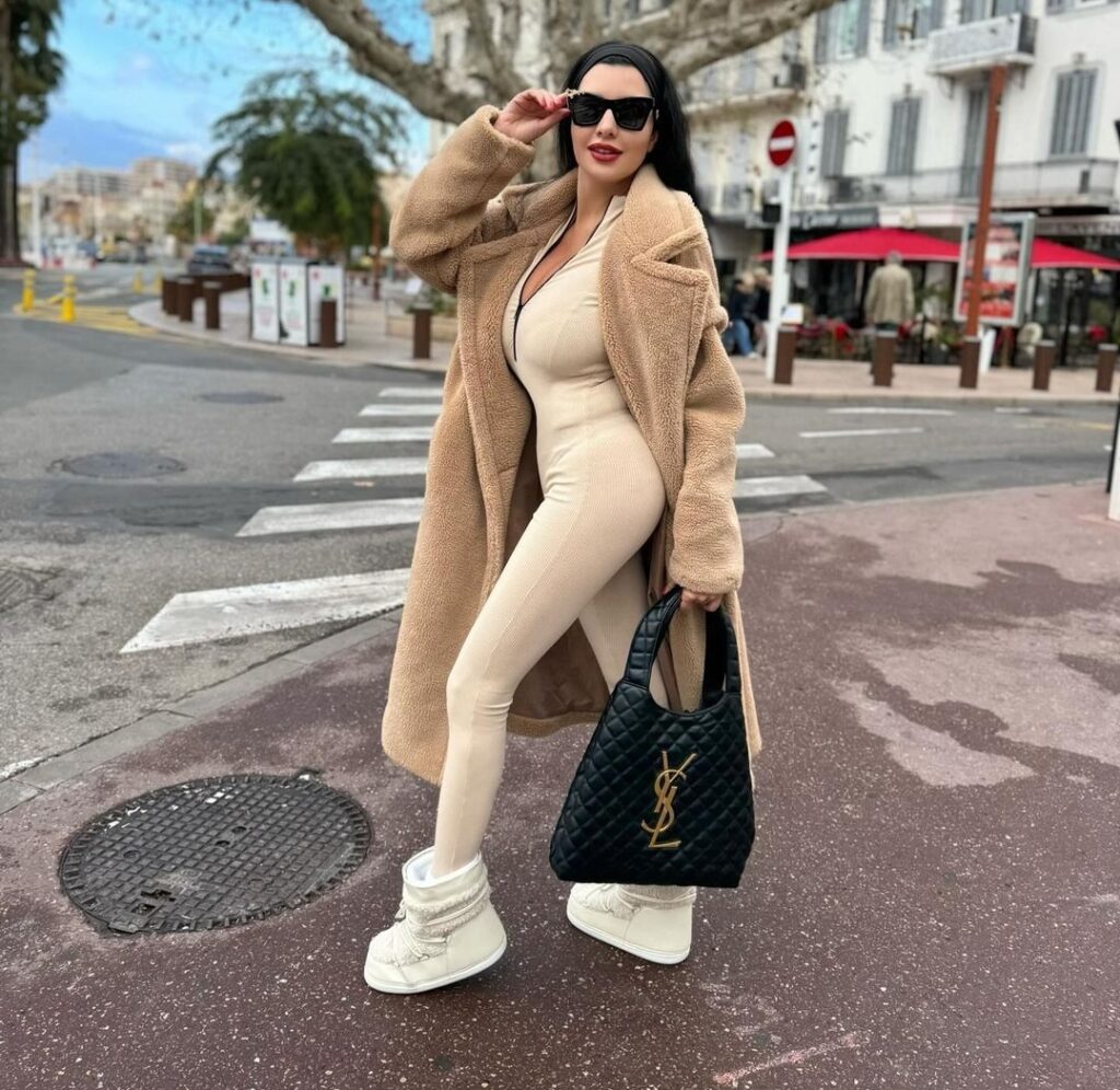 ونسقت بالمانطو شتوي صمم من الفرو بنفس اللون فوقه حتي تسيطر على الطقس البارد، فيما انتعلت هاف بوت بنفس اللون.