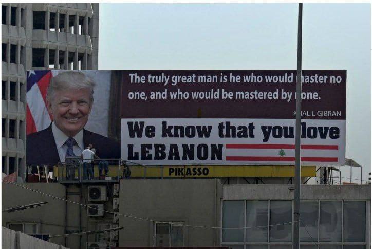 انتشر عبر مواقع التواصل الاجتماعي صورة للرئيس الأميركي دونالد ترامب على احدى اللوحات الإعلانية بالقرب من جسر الواطي في بيروت، وكتب عليها: “نعلم أنك تُحب لبنان”.