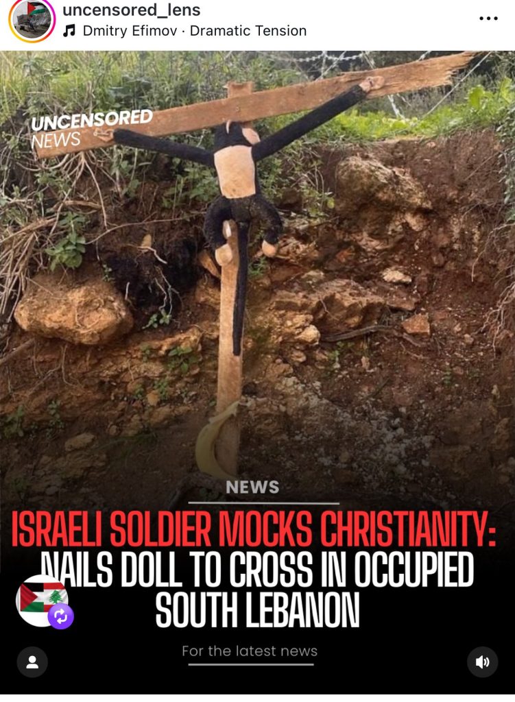 وبحسب ما نشره حساب “uncensored_lens”، فإن الجندي الإسرائيلي قام بتثبيت الدمية على صليب خشبي بطريقة مهينة، في خطوة اعتبرها كثيرون إساءة مباشرة للديانة المسيحية ولرمزية صلب المسيح. وقد لاقى هذا التصرف تنديدًا واسعًا على منصات التواصل، لا سيما في ظل تصاعد التوترات في الجنوب اللبناني.