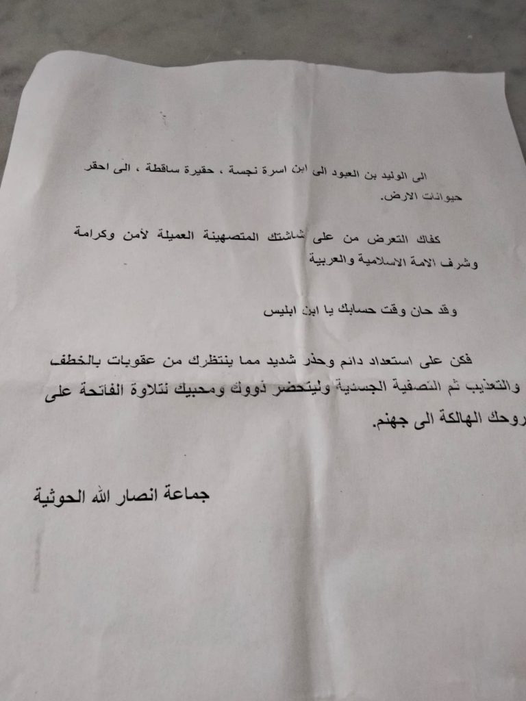 “هيك تصبّح الإعلامي وليد عبّود اليوم تحت بيتو . منشورات موقّعة باسم جماعة إر..ها.بية عم تهددو بالخطف والقتل. في ناس بدا تاخد البلد ع مطرح كلنا عم نتجنّب نروح عليه لانو السلم الأهلي خط أحمر. منطالب
